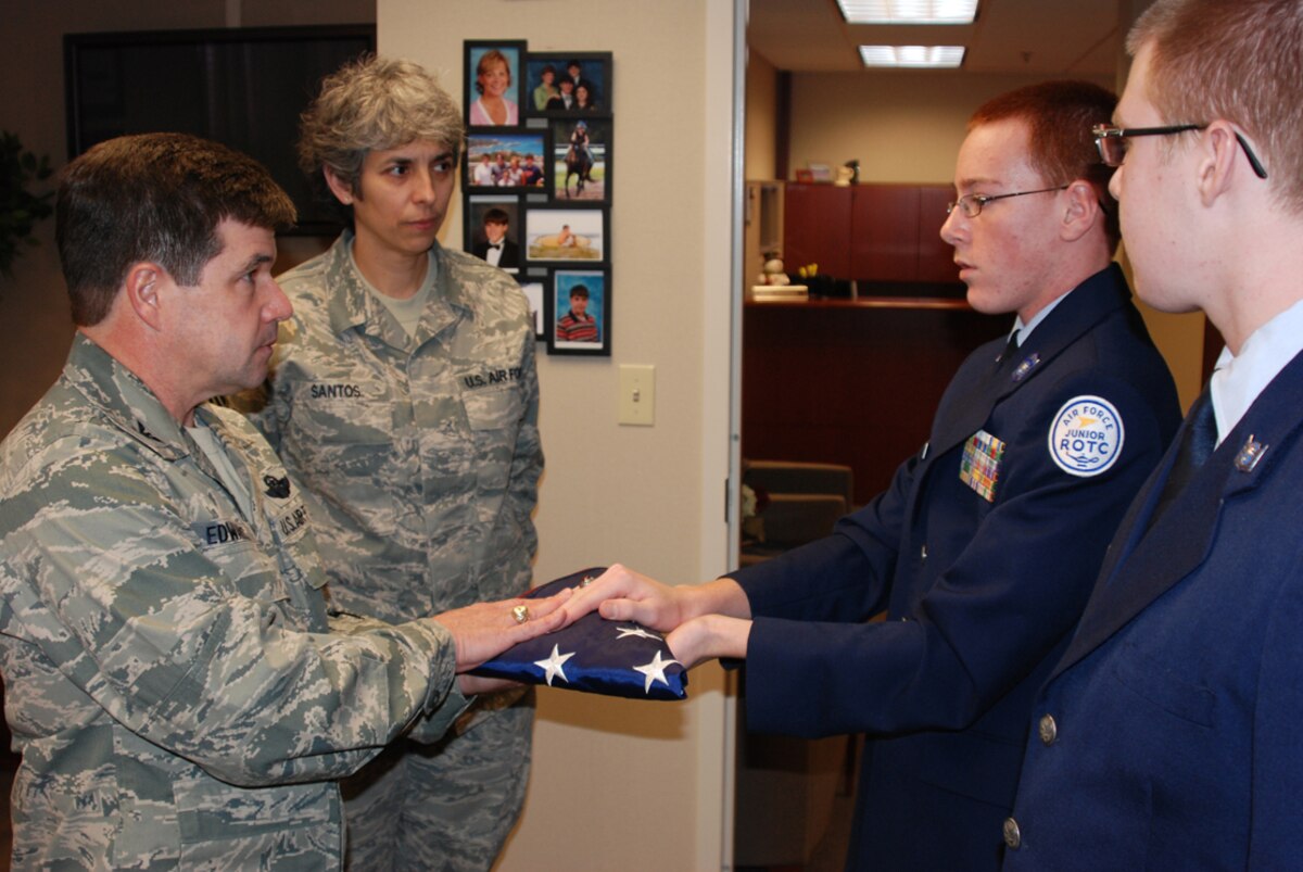 Command Chief Master Sgt. Sandra Santos watches. The Illinois cadets, from Mascoutah High School near Scott Air Force Base, presented the flag in memory of Tech. Sgt. Anthony Campbell, who died while on duty in Afghanistan. (U.S. Air Force photo/Maj. Stan Paregien)